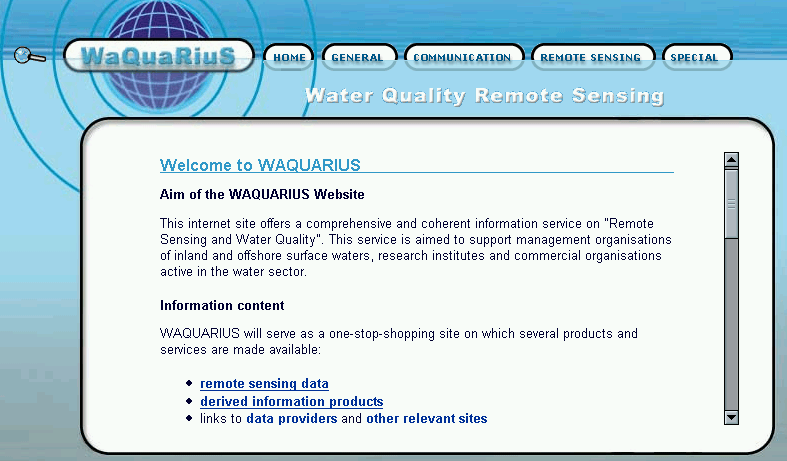 The platform provided access to remote sensing data related to water quality, alongside background information on systems such as LANDSAT, NOAA, MERIS, SeaWiFS and MOS. Additional supporting information included in-situ measurements, model simulations and depth maps. Communication and knowledge exchange were integral components of the platform.